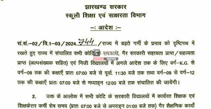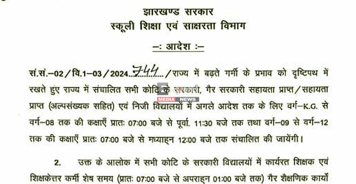 रांची (एक्सपर्ट मीडिया न्यूज)। झारखंड में लगातार बढ़ती गर्मी और हीटवेव जैसे हालात को देखते हुए राज्य सरकार ने एक अहम फैसला लिया है। स्कूली शिक्षा एवं साक्षरता विभाग द्वारा जारी आदेश (संख्या-02/वि.1-03/2024…4744) के अनुसार अब राज्य के सभी सरकारी, गैर-सरकारी सहायता प्राप्त (अल्पसंख्यक सहित) और निजी विद्यालयों में कक्षाओं का समय घटा दिया गया है। यह आदेश 21 अप्रैल 2026 से अगले निर्देश तक प्रभावी रहेगा।